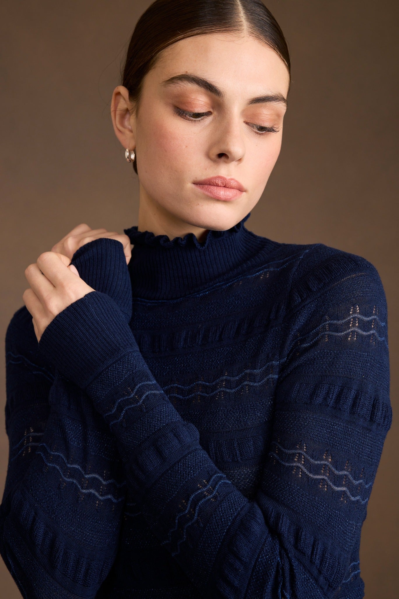 Your new favorite body-skimming turtleneck gets a feminine upgrade with allover folded ruffle details, plus a delicate pointelle knit woven with metallic yarn for a subtle shimmer.