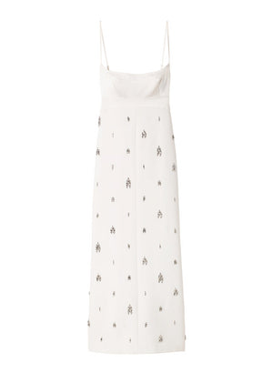 The Alana Dress combines our structured cady fabric and high-shine satin with crystal embellishments in timeless white. This midi silhouette features a straight skirt and bustier-inspired bodice with adjustable straps, side cutouts, and an open back. We recommend to size up one from your typical size.