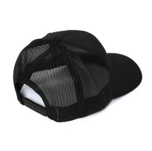 Bird & vine logo trucker hat has foam front, mesh back, snapback, curved brim, woven label, and fully adjustable