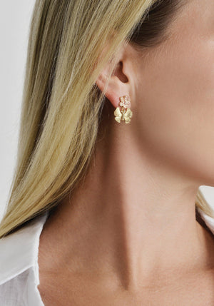 These earrings are crafted from 18k gold dipped brass and feature bejeweled butterflies and pink accented flowers. These artfully sculpted pieces are an elevated and playful addition to your jewelry wardrobe, making them the perfect accessories for any occasion. Add some whimsy and charm to your look with these unique butterfly and flower earrings. Crafted with 18k gold dipped brass, these earrings bring a touch of shine and color to any outfit. Perfect for any occasion, they're a fun and playful addition to your jewelry collection.