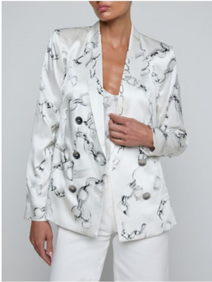 Subtle feminine shaping balances the crisp tailored details of the timeless Colin blazer. Double-breasted with gold buttons, it’s a tailored piece designed to go from desk-to-drinks in style. Now back in ivory with a chain print.