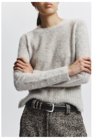 The Raylan Crewneck Fluffy Sweater in Pale Grey Heather features a soft wool and alpaca blend that offers both warmth and refined comfort.