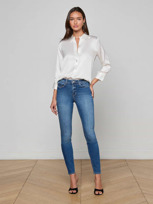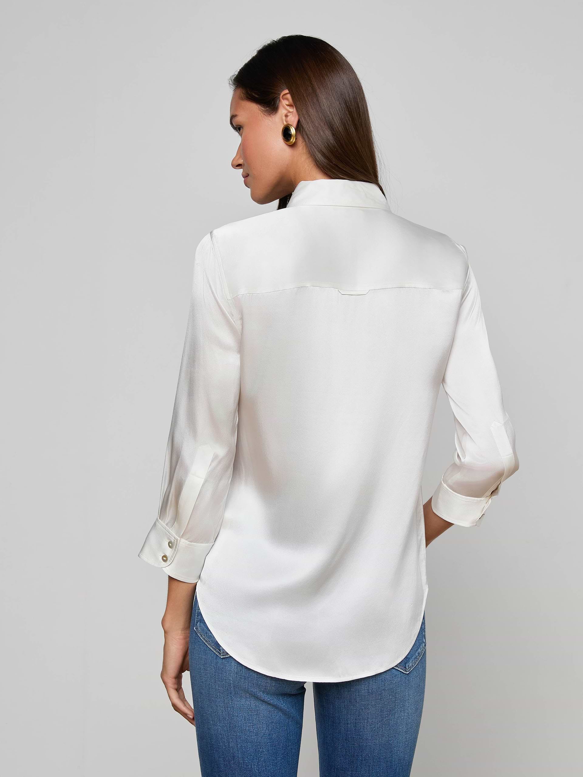 A classic button-down blouse with a luxurious, light catching luster. Charmeuse silk in soft ivory drapes effortlessly to a shorter, curved hem. Three-quarter-length sleeves and a relaxed open collar balance elegance with wearability. 100% silk.