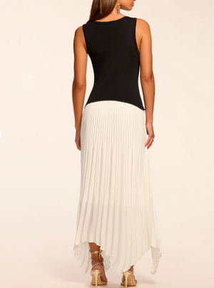 Contrast is everything. The Davinia pairs a stretch knit bodice with a pleated skirt featuring a handkerchief hem that moves beautifully. This sleeveless silhouette brings dimension and flow to weddings, evening events, or anywhere you want to make an entrance.