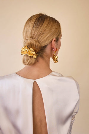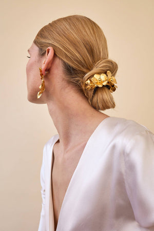 We combined our love for elevated pony cuffs with the best selling Eden capsule, to create the luxe and romantic Eden Pony Cuff. Secure your tresses with an arch of 14 karat gold plated flowers for a modern and romantic look. Perfect for a bridal look, special occasions or an elevated day to day look.
