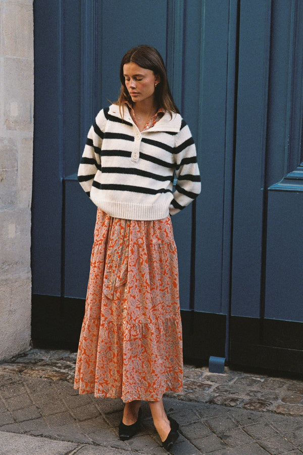 The Juneau Sweater is a polo style knit sweater with vintage cream buttons, standard body length and flexible ribbed cuffs, collar and bottom waist band. The Juneau Sweater offers warmth and classic alpine style for cool weather layering. Shown here in Teal Stripe and made from our alpaca wool blend.