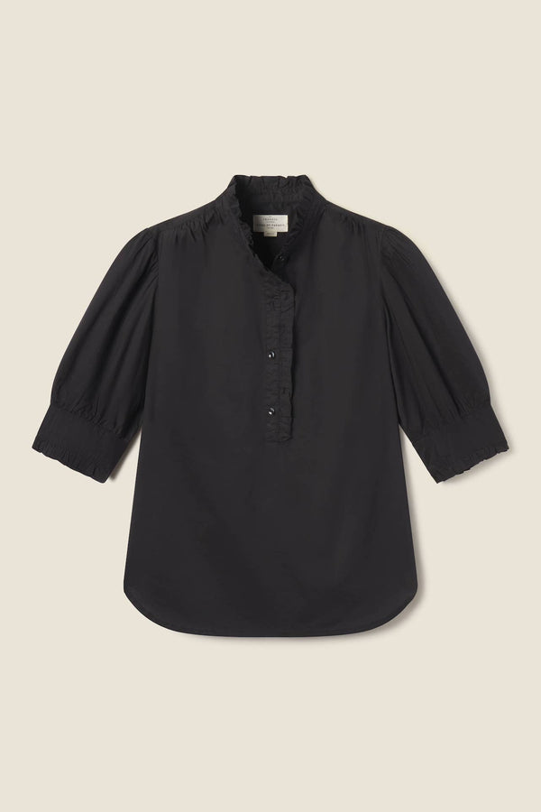 The Noah Shirt is our classic button-down shirt with added feminine details. The standup collar and center front button placket have self-fabric ruffle details. Half Sleeves gather into cuffs with ruffle detailing. Shown here in Black. Made from our crisp cotton poplin.
