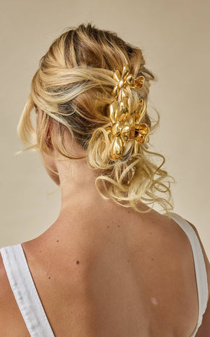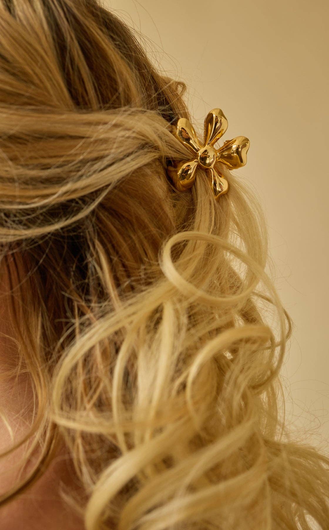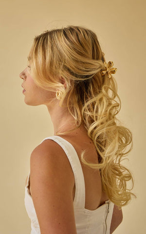 Our best selling Glossy Daisy Claw Clip, now available in mini. Perfect for the thinner hair girlies, this mini claw clip is great for on the go or an easy updo. Plated in 14 karat gold, this chic and elevated claw clip instantly elevates any updo. Get ready to make a statement with our exclusive daisy design.