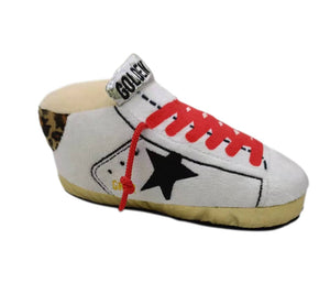 Golden Pooch Get the distressed sneaker toy with soul! Our parody take on the iconic tennis shoe is not only jaw-dropping, it’s also drool-inducing! Just like the original, the plush white exterior is sure to become more authentic-looking with age. Unlike the original, this one features a delightful squeaker inside that will instantly make it a favorite with your furry fashionista! Dimensions are 3” x 10” x 4”