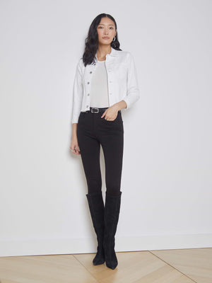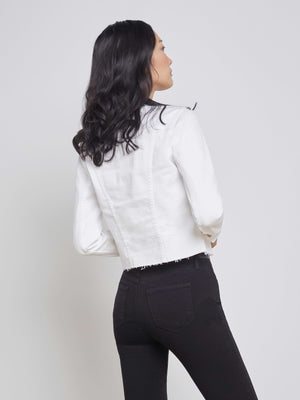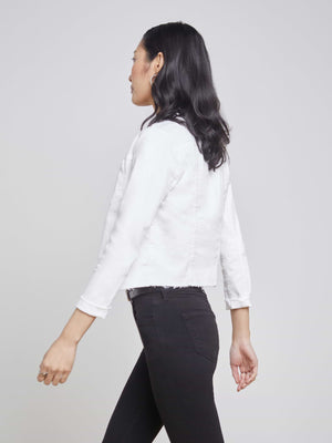A white denim jacket with a feminine fit and an ultra-soft feel. Luxurious stretch denim hugs the body while allowing complete freedom of movement. Timeless design features a classic collar, double chest pockets, and a front button closure. Slimming tapered seams and a raw, ravaged hem add a modern edge.