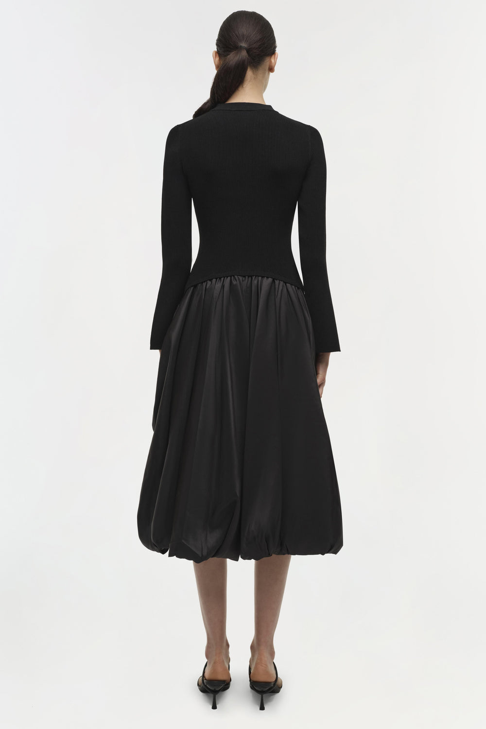 The Kenlie Dress in Black. This long sleeve mock neck midi combines a fitted top with a voluminous, gathered skirt, creating a striking contrast. The unique silhouette and mock neck design make it a standout piece.