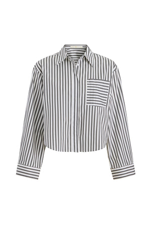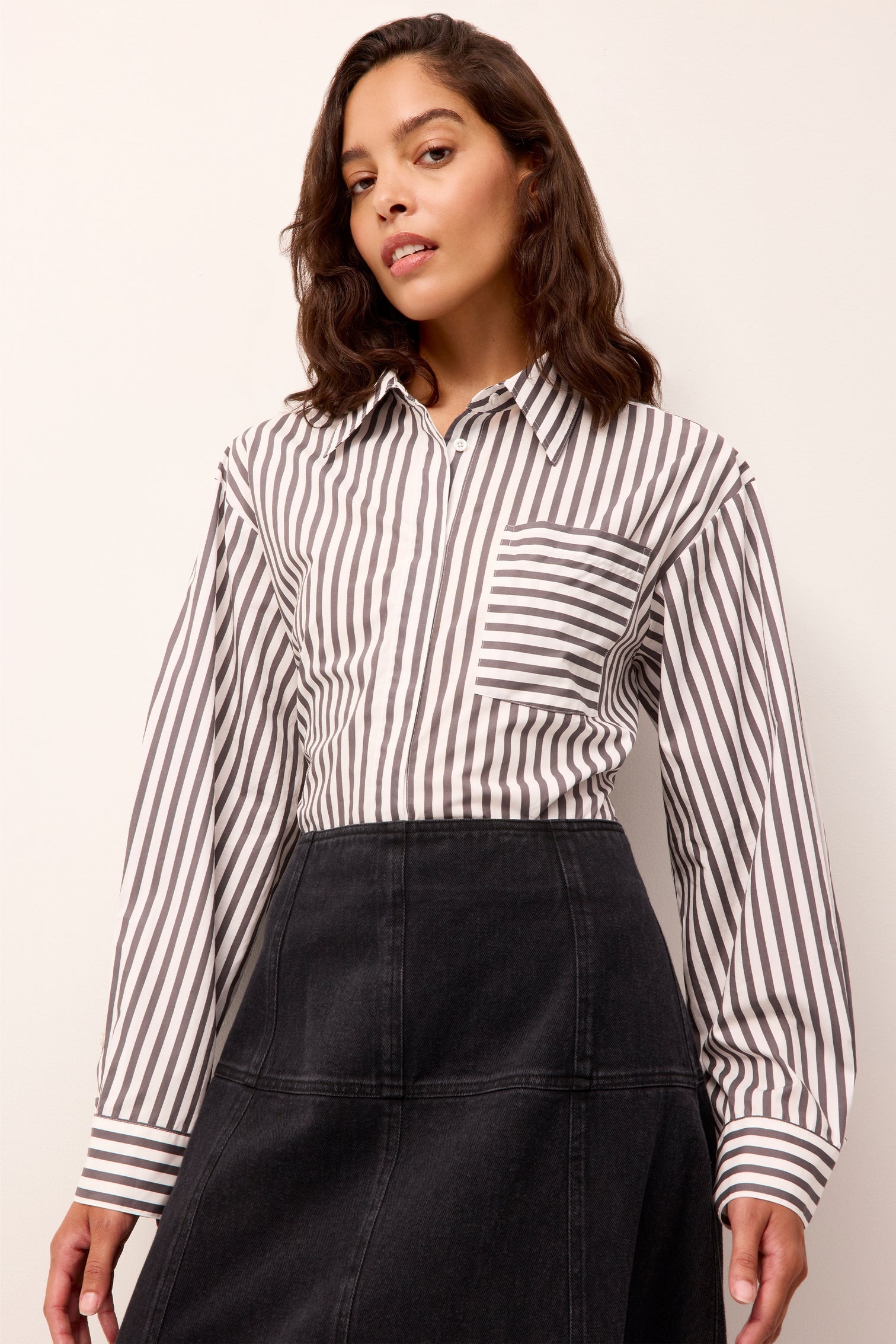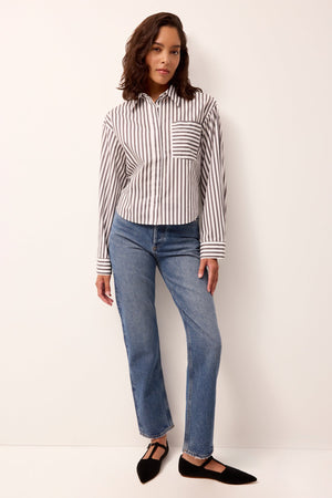 A cropped button-down is a contemporary autumn staple, and we love the way this striped version with a contrasting patch pocket looks with both jeans and our sleek Yuko denim midi skirt.