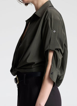 Crafted in stretch silk, this button-down updates classic shirting with convertible sleeves and a twisted cropped hem.