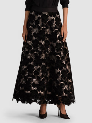 The Lorena skirt is a statement alternative to a gown, designed in velvet cutwork layered over tulle for dramatic volume. Its high-rise, drop-waist silhouette elongates the frame while the relaxed fit brings movement and ease.