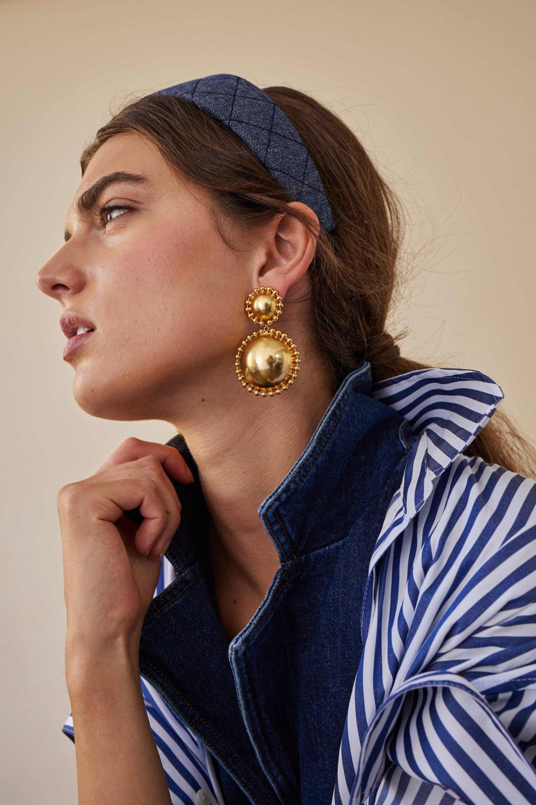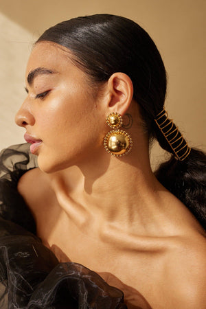 The Lucia Dome Earrings features a dome like hanging stud with a dangling metal bauble, bordered in small ball chains creating a more modern look. Perfect for any special occasion, the Lucia Earrings will add the finishing touch to your ensemble.