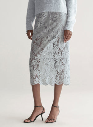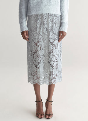 The Lydia Skirt is classic lace reinterpreted in a column silhouette. Cut from archival French lace with a botanical-inspired pattern, this midi-length sheath layers over a built-in mini slip for a streamlined, contemporary shape. Finished with scalloped edges, it’s a polished yet romantic piece for holiday evenings, cocktails, or special occasions.