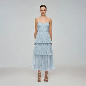 Elevate your dress collection and get ready for summer evening parties with this stunning Metallic Floral Tiered Midi Dress from Self Portrait, crafted from thin and lightweight materials for a summery style and a comfortable feel. The dress features thin shoulder straps for an elegant upper look, sitting above the ribbed chest which flows down into the three-tiered skirt which is pleated for a flowy look. The design feature metallic elements as part of the all-over floral pattern.