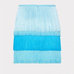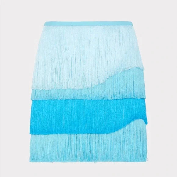 For all of your summer soirees, the Odelia mini skirt is layered with rows of ombre sea blue fringe that are fashioned asymmetrically to create a waive effect. Wear it to all your summer date nights and getaways.