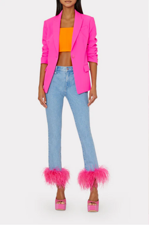 Medium wash skinny jean with an added pop of pink feather detail. Keep it casual with a pair of fun slides or wear them out with a super high heal.