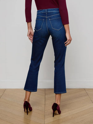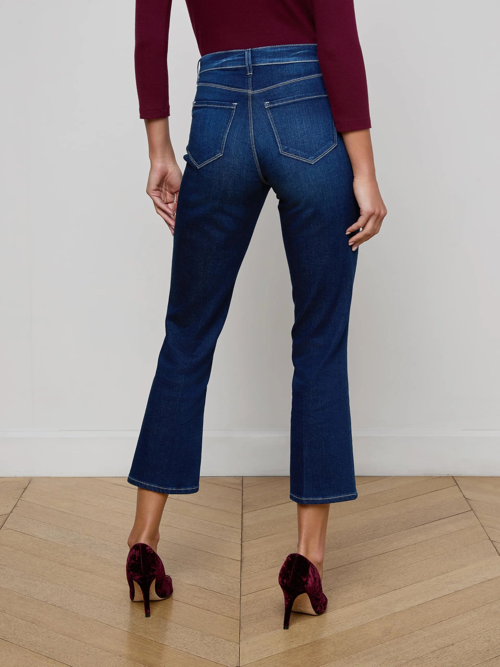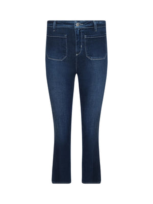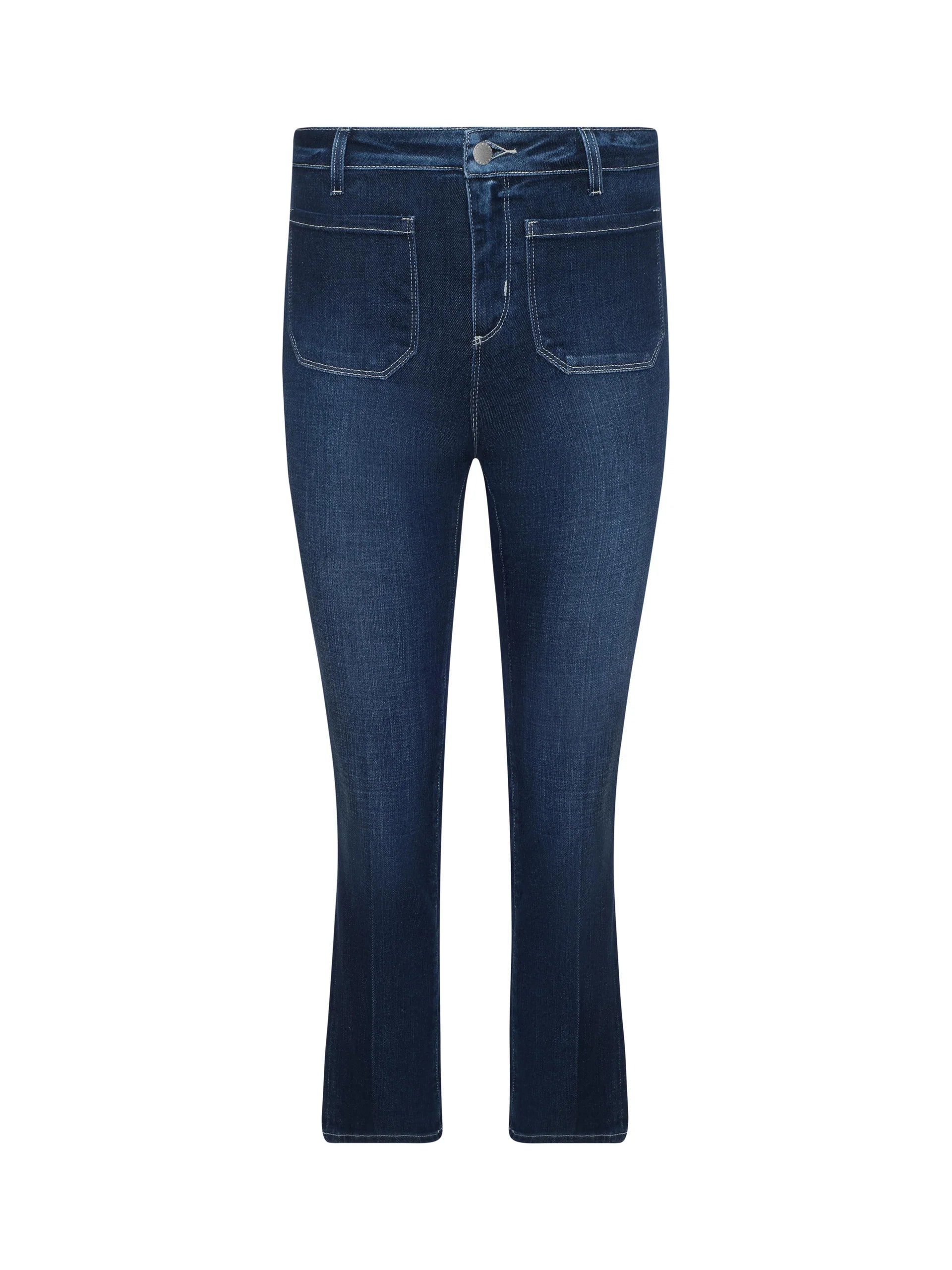 An easy cropped kick-flare jean with the polished look of a trouser. Patch pockets add a subtle retro appeal. Now in a dark blue wash with slight fading designed to contour the leg for a flattering, lengthening effect.