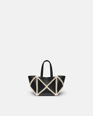 Origami tote folds completely flat to offer a functional solution for storing all your essentials with a long strap to wrap around the body. Now in a new mini size and crafted from soft patent alt-nappa, contrasting merrow stitch is used to create a patchwork effect.