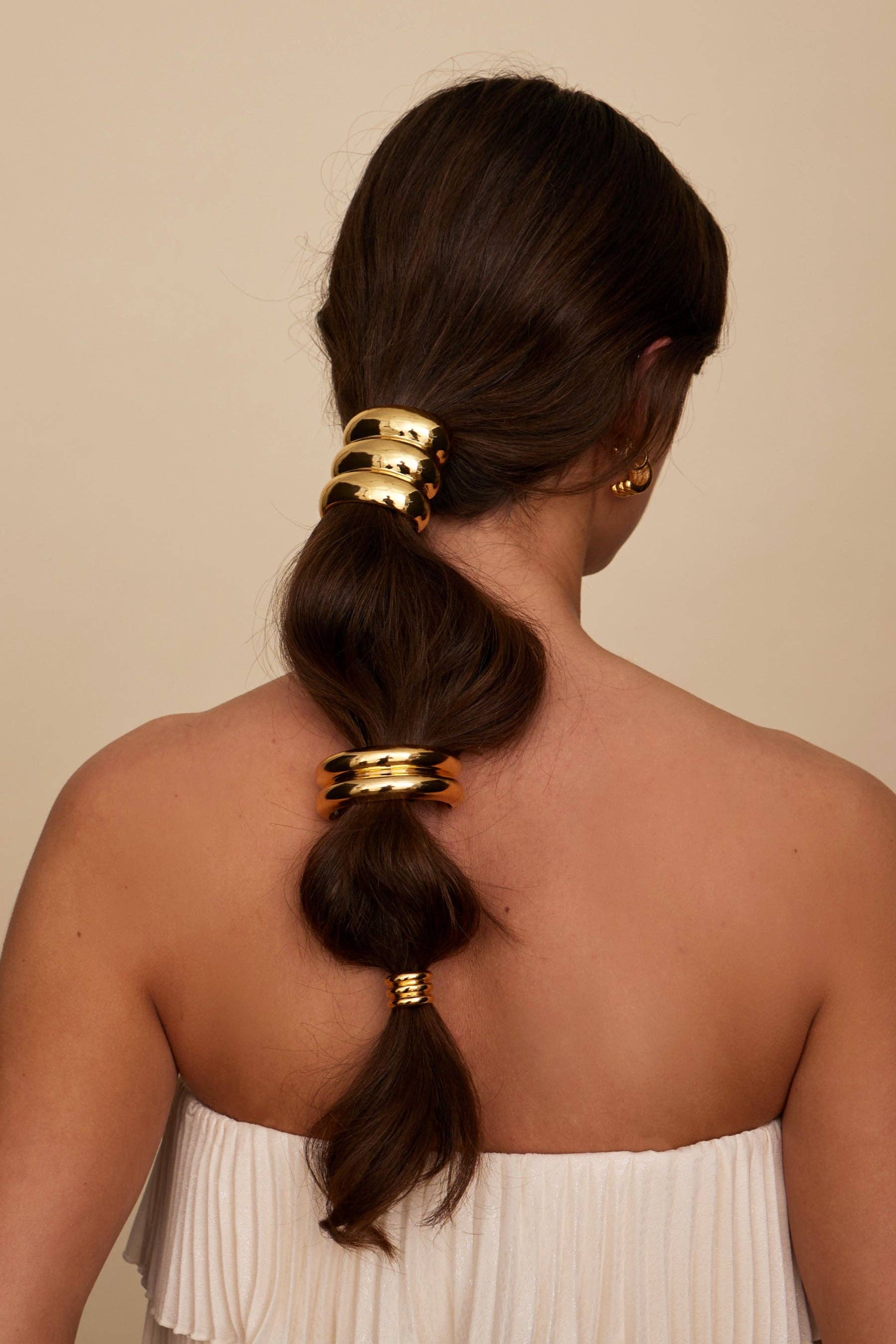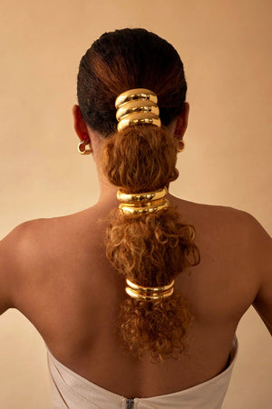 Introducing the Petite Double Glossy Arch Pony, a thinner version of our best selling Double Glossy Arch Pony Cuff. After receiving lots of feedback about wanting a lighter weight thinner cuff from you guys who have finer, shorter or less voluminous hair, we created this new version of our most coveted Double Glossy Arch just for you. Additionally we love how this double petite arch pairs back with our original double arch for a fun juxtaposition of scale in a double pony cuff look. Upgrade your ponytail game with this must-have new piece.