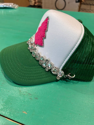 Don't forget to pair with one of our trucker hat chains. Pictured here with our over-the-top Jumbo Rhinestone Trucker Hat chain for the ultimate Christmas trucker!