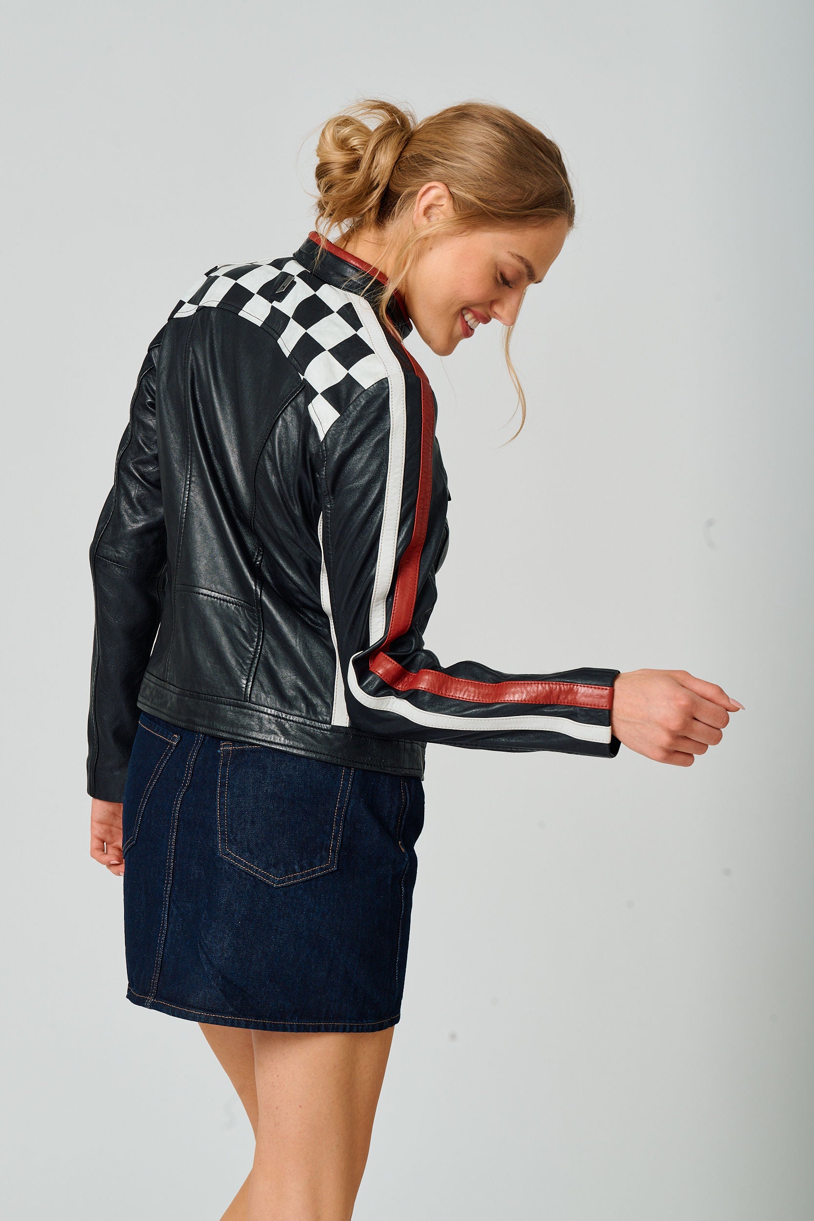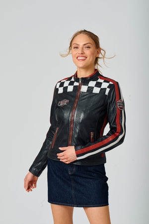 Classic women’s racer jacket with checkered detailing and red racing stripes down sleeves and zippers.