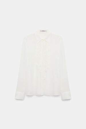 The georgette blouse has a relaxed fit and twisted edge detailing on the asymmetrical plastron. The shirt has a back yoke with an inverted pleat.