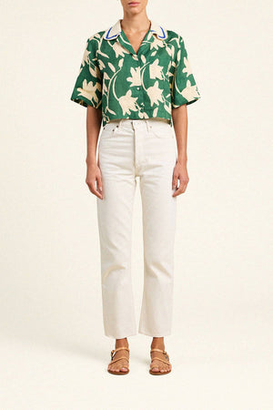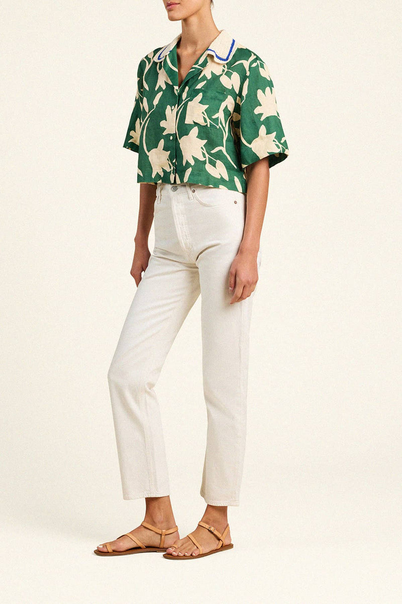 The Thia Shirt is our elevated camp shirt, with a slightly cropped body, short sleeves and a hand-crocheted collar trimmed with a cobalt striped border.